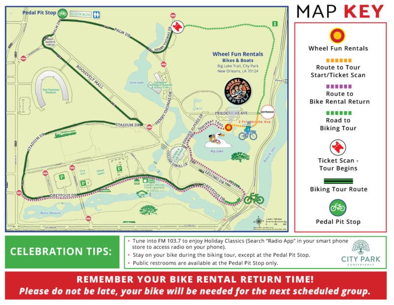 | ◦ 6:45pm: Return Bike to Wheel Fun Rentals NOTE: the Celebration in the Oaks will take approx. 40-50 minutes to ride through. YOU MUST return your bike rental by 6:45pm, see map for directions back to Wheel Fun Rentals bike return. |