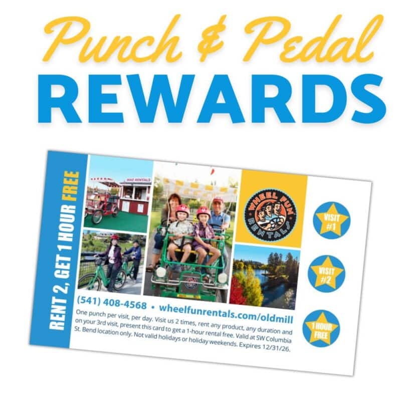 At Wheel Fun Rentals, every ride brings you closer to your next FUN adventure! With your very first rental you’ll receive a “Punch & Pedal” Rewards Card and already have a head start – your first visit hole punch!